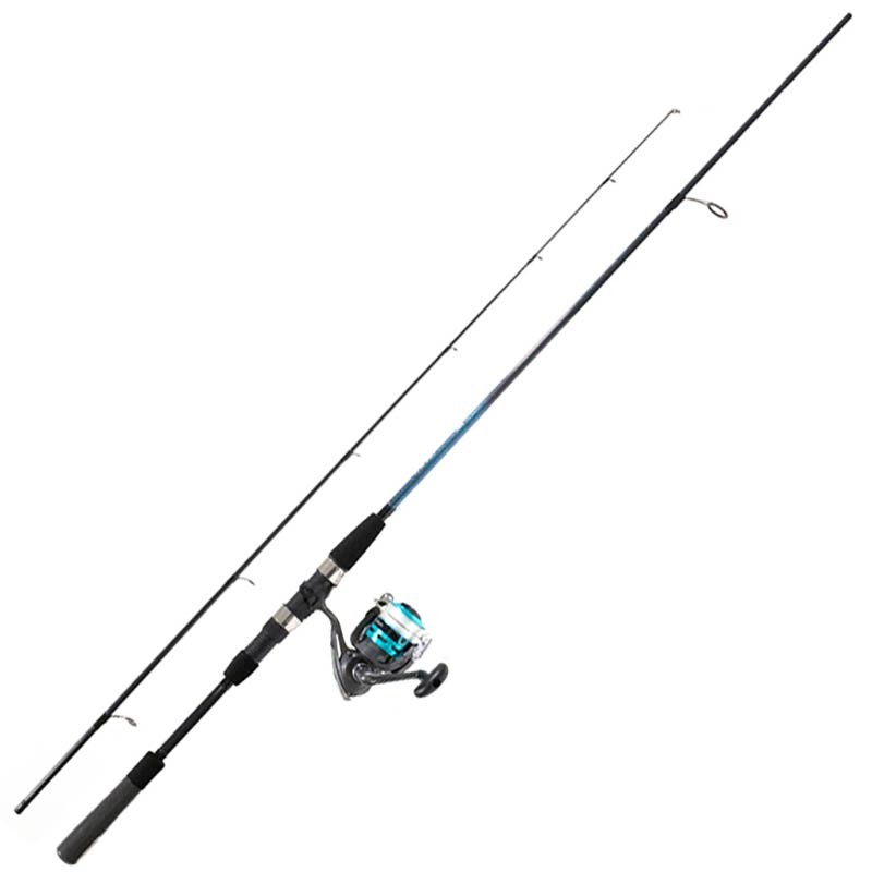 Ensembles leurre mer. Canne Firespin, à emmanchement inversé, en carbone et composite avec anneaux chromés monopattes. Moulinet FS frein avant garni de nylon en 30/100.