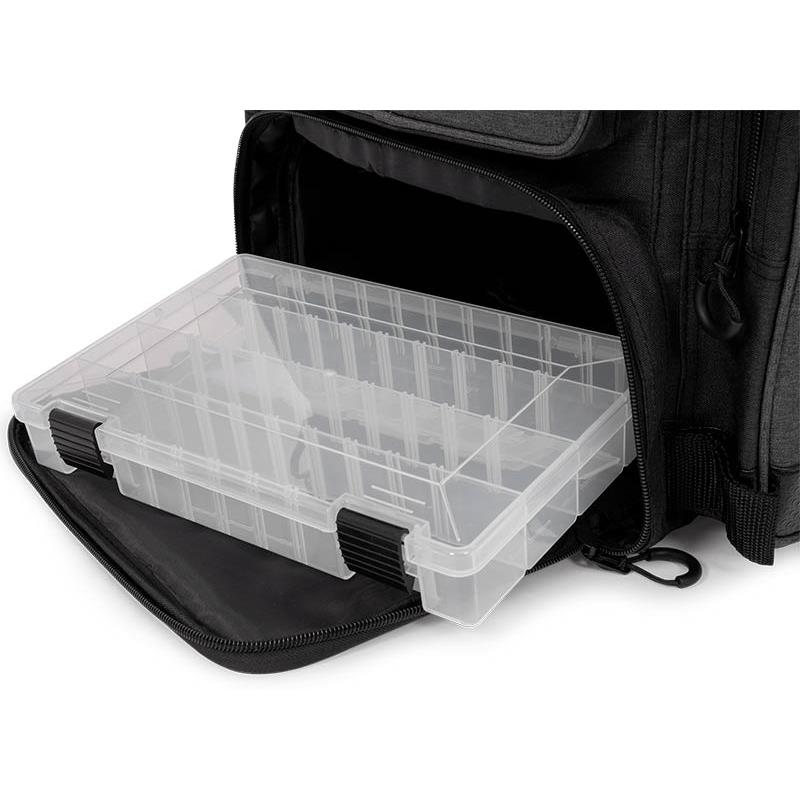 Ce sac à dos compact est doté de quatre poches extérieures et bénéficie d'un grand compartiment intérieur. Il est également équipé de sangles extérieures pour fixer des accessoires et du petit matériel. Il comprend une boîte à pêche compartimentée située à l’intérieur du sac.