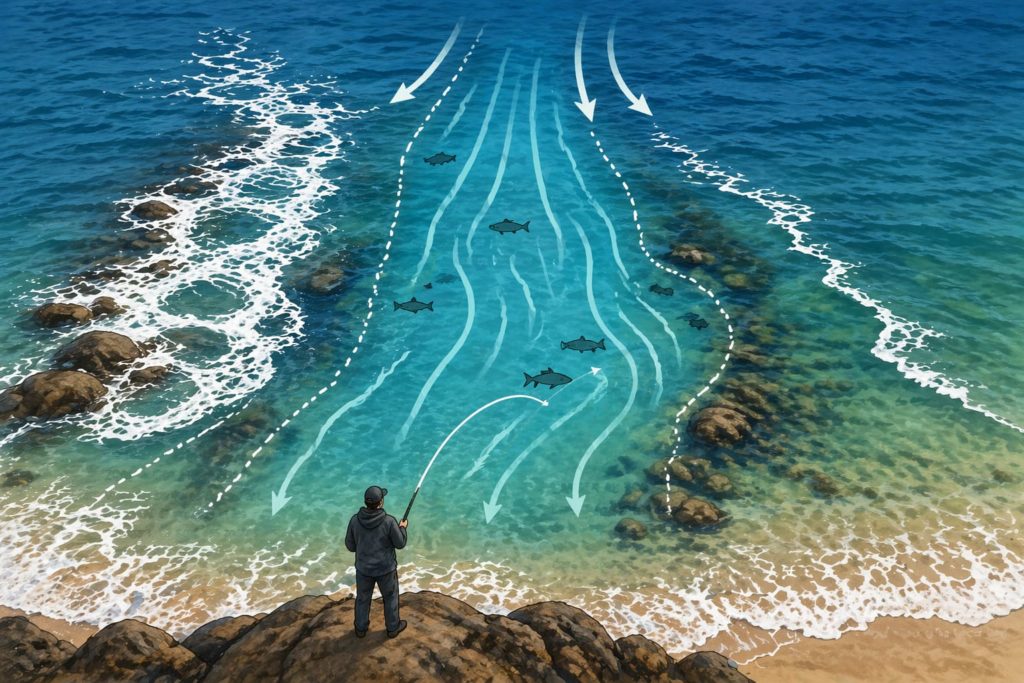 Depuis le bord, tu n’as pas d’électronique pour t’aider, donc tout passe par l’observation. Et il y a toujours des indices. Une zone de mousse, une cassure dans les vagues, un changement de couleur ou une veine de courant sont autant de signes à ne pas ignorer. Une veine de courant, par exemple, agit comme un couloir où la nourriture circule. Si tu arrives à repérer ça, tu sais déjà où lancer. Ce n’est pas une question de distance, mais de précision. Un lancer bien placé fera toujours la différence.