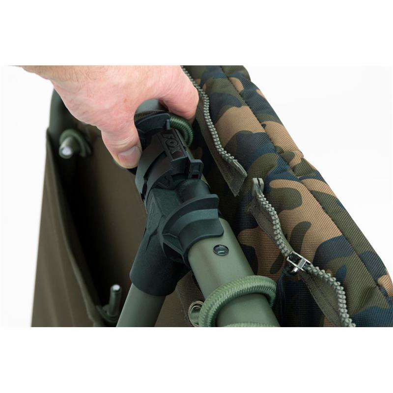 • Klettbänder in der Mitte auf der Unterseite der Matratze ermöglichen die Verwendung aller Modelle von Schlafsäcken und Decken von fox.