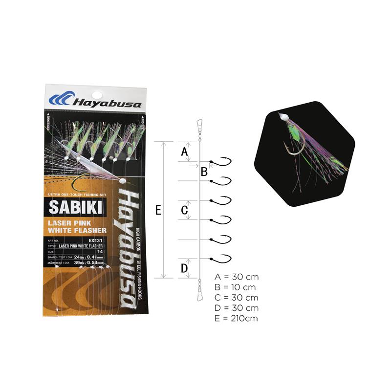 Der Sabiki EX131 HAYABUSA ist mit 6 Haken (Ref.: H.MRS 171 Nickel) ausgestattet. Perfekt zum Angeln von Makrelen und Pferdemakrelen, die Laser pink white flasher-Finish macht ihn äußerst sichtbar und noch attraktiver.