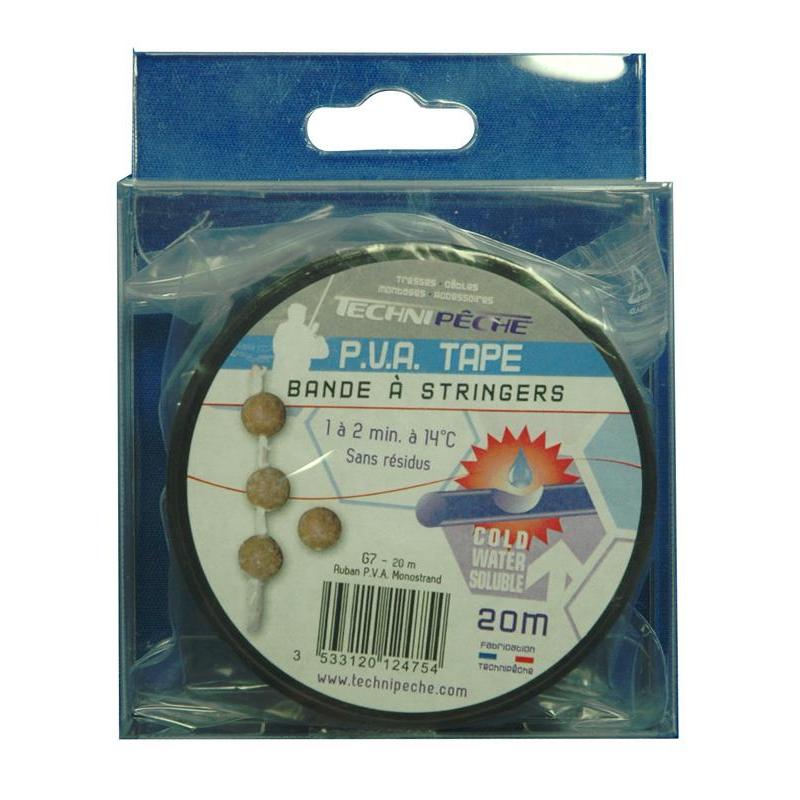 Kalt löslicher Streifen von Technipêche. Zur Vorbereitung. Man wickelt den Streifen um den Haken, der Streifen klebt, wenn man ihn auf den Haken andrückt, mit etwas Speichel oder Wasser. Die Spitze ist während der Positionierung der Montage geschützt. Spule 20m.