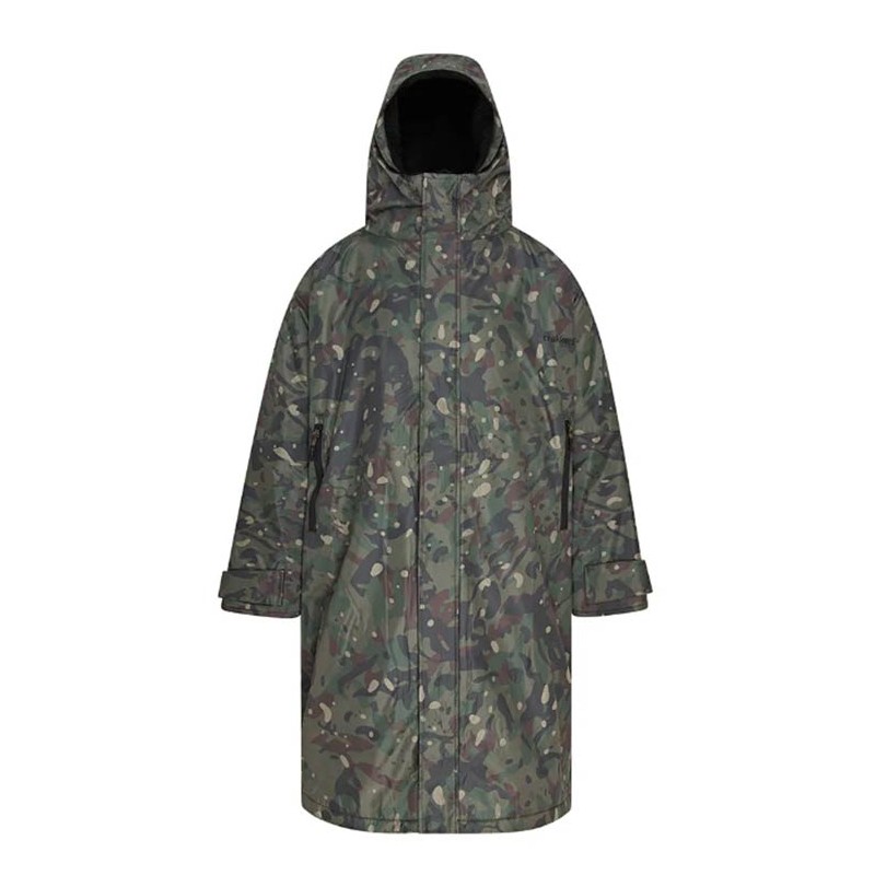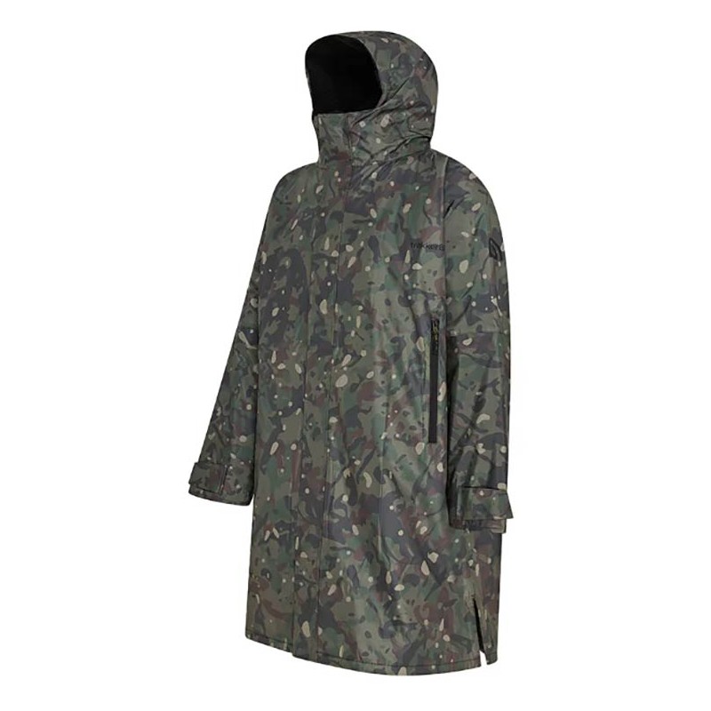 Die Trakker CR Camo Robe ist aus einem sehr wasserdichten Außenstoff gefertigt, mit einer Wassersäule von 5 000 mm und vollständig versiegelten Nähten; dieses Kleidungsstück bietet maximalen Schutz vor den Elementen. Die mit Fleecefutter versehenen, mit Reißverschluss ausgestatteten Handwärmtaschen und das dicke Sherpa-Fleecefutter bieten eine außergewöhnliche Isolierung. Die Kapuze mit Sherpa-Fleecefutter sorgt für zusätzliche Wärme und Schutz, während verstellbare Bündchen eine bequeme und sichere Passform gewährleisten.