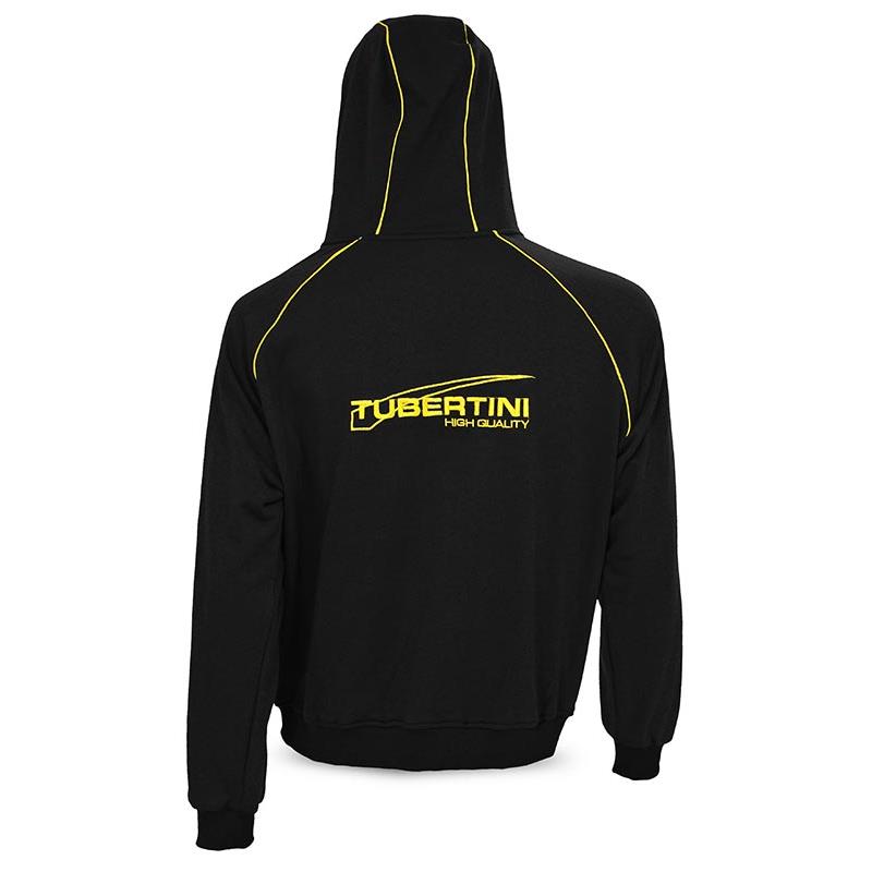 Leichter, praktischer Sweat aus Baumwolle mit Reißverschluss und gelben, bestickten Tubertini-Logos. Besonders auffällig ist die Verarbeitung der Kapuze: gelb gefüttert mit versteckten Kordeln.