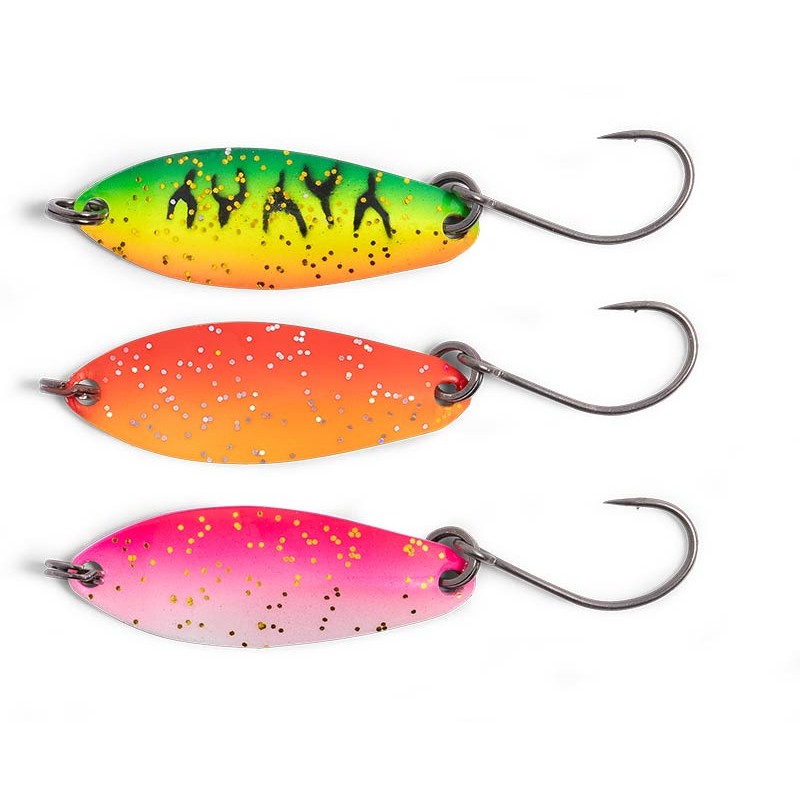 dieses set umfasst 3 forellenlöffel mit unserem einzigartigen design. ihre besondere form verleiht ihnen eine maximale aktion, die sich bei forellen bewährt hat und den vorteil bietet, bei unterschiedlichen geschwindigkeiten eingeholt werden zu können, sei es im bach oder im see. sie lassen sich dank ihres massentransfers, der sich in richtung des oberen teils des löffels bewegt, leicht auf große distanz auswerfen. einfacher haken mit ptfe-beschichtung. drei pro beutel. farben : firetiger mit bronze. weiß/rosa mit schwarz. orange/rot mit silber. verpackt in einer kleinen schachtel mit einem eva-einsatz, um die spitze des hakens beim transport gut zu schützen, damit sie immer scharf bleibt.