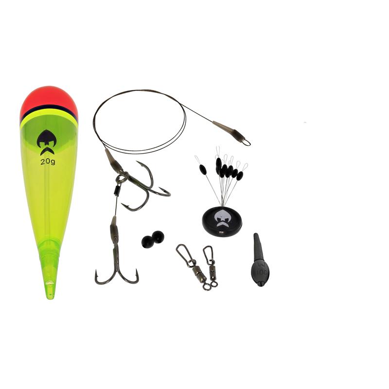 • Einsatzbereit • Robuster PVC-Schwimmer • Transparente wassergrüne Tarnung • Antennen mit hoher Sichtbarkeit • Innenrohr, um das Durchziehen der Schnur zu erleichtern • Verstärkt durch eine Metallhülse oben am Rohr zum Schutz der Schnur • Perfektes Vorfach für tote Köder und Fischstücke • Hergestellt aus 7-adrigem Stahldraht 30 lb • Extrem robuste und extrem scharfe Haken • Diskrete Tarnhülsen