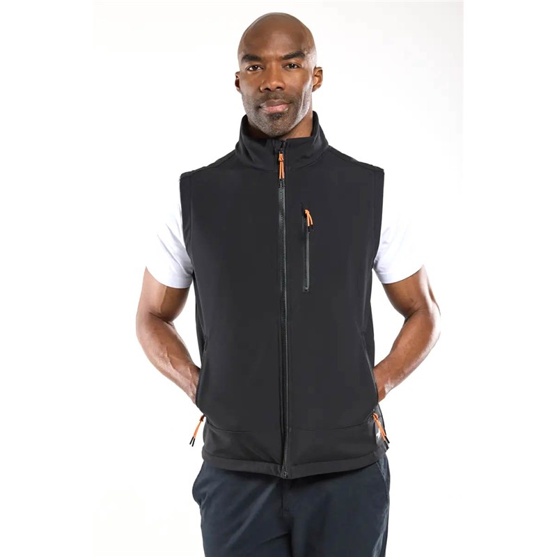 weste softshell ohne ärmel, 92% recyceltes polyester 8% elasthan mit fleece unterlegt, hoher kragen, vorne wasserabweisender reißverschluss, kinnschutz, zwei untere reißverschlusstaschen, bermudes-badge am saum der weste und applikationen am kragenrücken und an der weste.