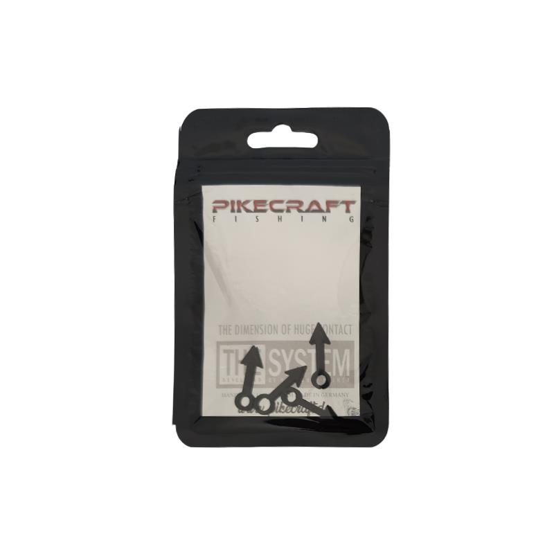 Der quick pin ist in zwei Größen erhältlich. Die Unterscheidung erfolgt nicht über Länge oder Breite, sondern über die Öffnung der Öse. Beide Pins messen 2.3cm lang und 7mm breit. Die Pfeilspitze zeigt in den Körper des Köders und lässt die Öse nach oben offen. Es ist der Durchmesser der Öse, der den Größenunterschied ausmacht. Der pin small ermöglicht das Befestigen / Fixieren von Stahldrähten, selbst mit sehr kleinem Durchmesser. Der pin big ermöglicht das Befestigen / Fixieren von Rigs mit Wirbeln .