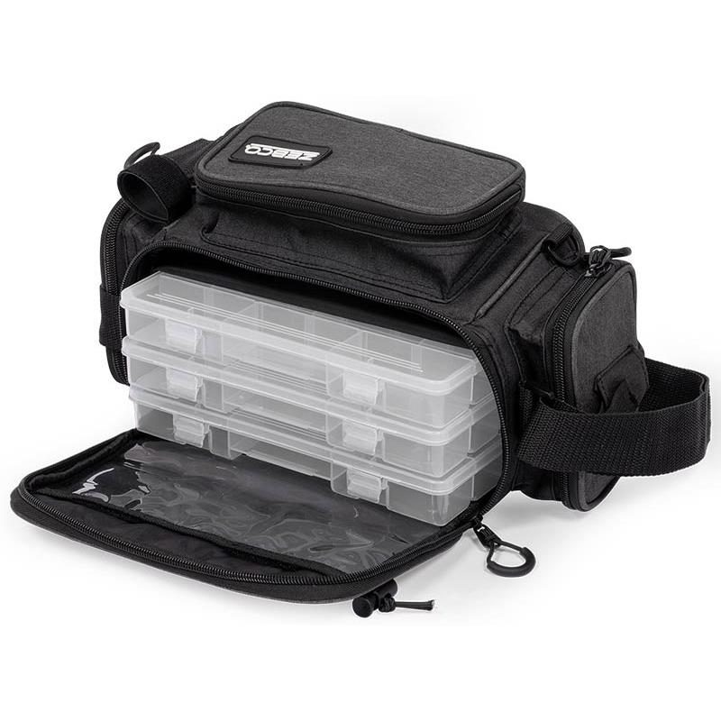 Diese geräumige Transporttasche ist mit drei Boxen ausgestattet und verfügt über drei Außenfächer. Sie ist außerdem mit einer kleinen transparenten Tasche im Inneren des Deckels ausgestattet, die das Aufbewahren von Dokumenten und kleinen Teilen für Montagen ermöglicht. Außen befindet sich außerdem ein Befestigungspunkt für Ausrüstung und andere kleine Angelartikel.