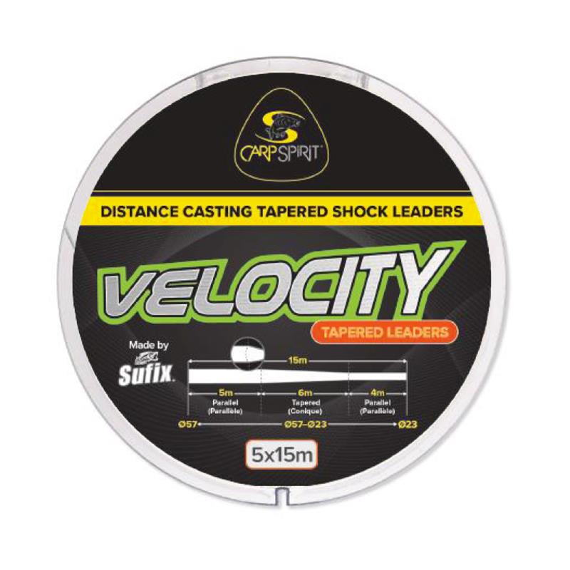 Hergestellt aus einem speziellen Polyamid-Copolymer sind die konischen Vorfächer velocity die ideale Lösung, um einen feinen Vorfachknoten zu erhalten, der leicht durch die Rutenringe gleitet, und dabei die Vorteile eines dickeren Vorfachs sowie eine hohe Abriebfestigkeit beibehält. Jedes Vorfach ist 15 m lang. Die ersten 5 Meter vorne sind parallel, gefolgt von einem konischen Abschnitt von 6 m in der Mitte, dann einem parallelen Abschnitt von 4 m am Ende. Falls erforderlich, kann der konische Abschnitt einfach verkürzt werden, um den Durchmesser zu vergrößern, bevor er an die Hauptschnur geknüpft wird.