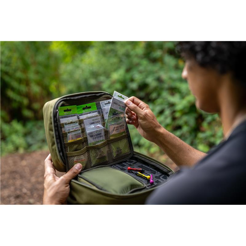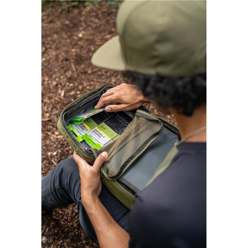Dieses Etui ist mit einem Trennfach versehen, das Taschen für Tackle-Material enthält, in denen Sie Hakenpackungen und Montagematerial sicher und ordentlich aufbewahren können.