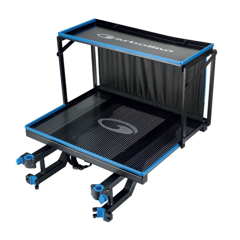 • Generation der Arbeitsstation 2026 • Zelt im Squadra-Design : Zweifarbig schwarz und blau mit logo Garbolino • Schutz der Kanten aus blauem Gummi • 2 Verankerungsfüße an der Station für optimale Stabilität • Arbeitsstation mit Doppelablage und Zelt • PVC-Schutzstreifen an den Kanten der arbeitsstation • Die obere Ablage ist klappbar und bietet Platz für die Zubehörteile, die man immer zur Hand haben sollte, • 2 Neigungsstufen möglich • Enthält 1 Satz Einsätze zur Befestigung einer abnehmbaren Kit-Halterung mit 10 Positionen • Kompatibel mit D25/D30/D36