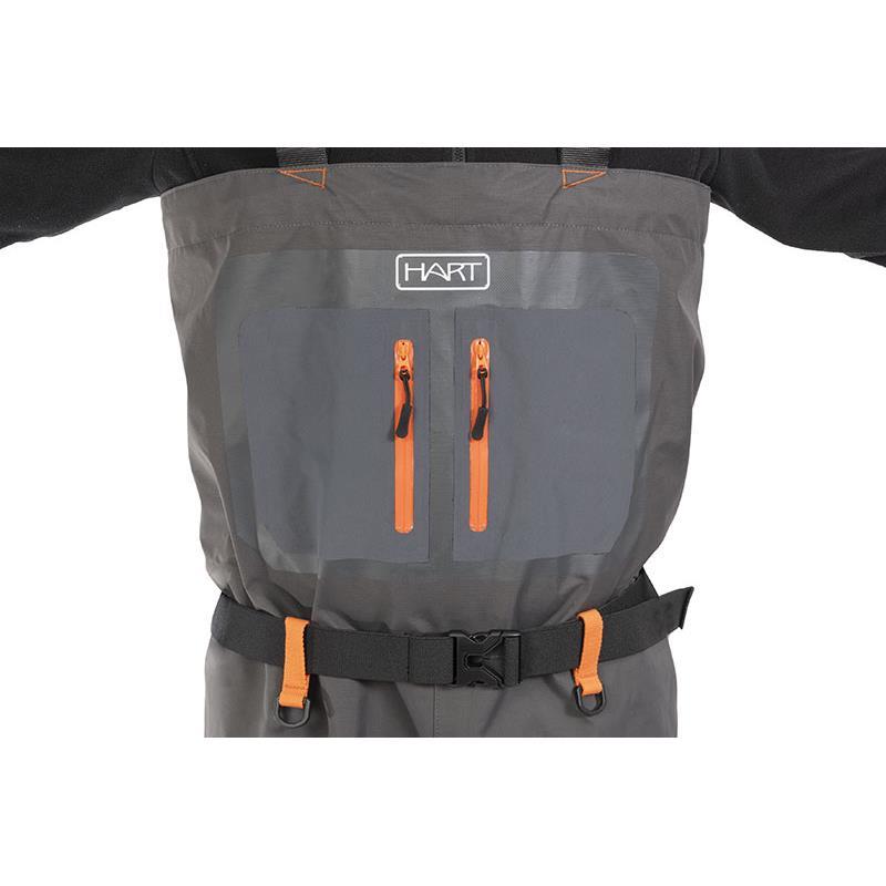Hüftwathosen aus verstärktem Ripstop-Gewebe, 3- und 5-lagig, für das Angeln im Fluss, auf Felsen, am Strand oder zum Angeln vom Float Tube. Ripstop-Gewebe mit laminiertem wasserdichten Material (WP 20.000mm)/atmungsaktiv 3 couches (WP 20000mm) am Rumpf und 5-lagig von der Taille bis zu den Knöcheln. Wasserdichte Nähte mit Dichtungen japanischer Herstellung. Brusttaschen mit wasserabweisenden YKK-Reißverschlüssen (ACHTUNG : dies ist keine wasserdichte Tasche). Innere Tasche mit Reißverschluss. Verstellbare elastische Träger für besseren Tragekomfort. Die kombinierte Brustbefestigung für Herren/Damen ermöglicht es, die Waders auf Taille umzulegen und sie zu befestigen, indem die Träger in einen Gürtel umgewandelt werden. Verstellbarer elastischer Gürtel mit Neopren-Bauchtasche. Ringe zum Befestigen von Zubehör und Werkzeugen. Elastische Gamaschen aus SCR-Neopren zum einfacheren Anziehen und zum Befestigen der Stiefel. Neoprensocken, hochdichte Sohle und gummierte Verstärkung an Ferse und Achillessehne, um den Verschleiß des Stiefels zu vermeiden. Tragetasche.