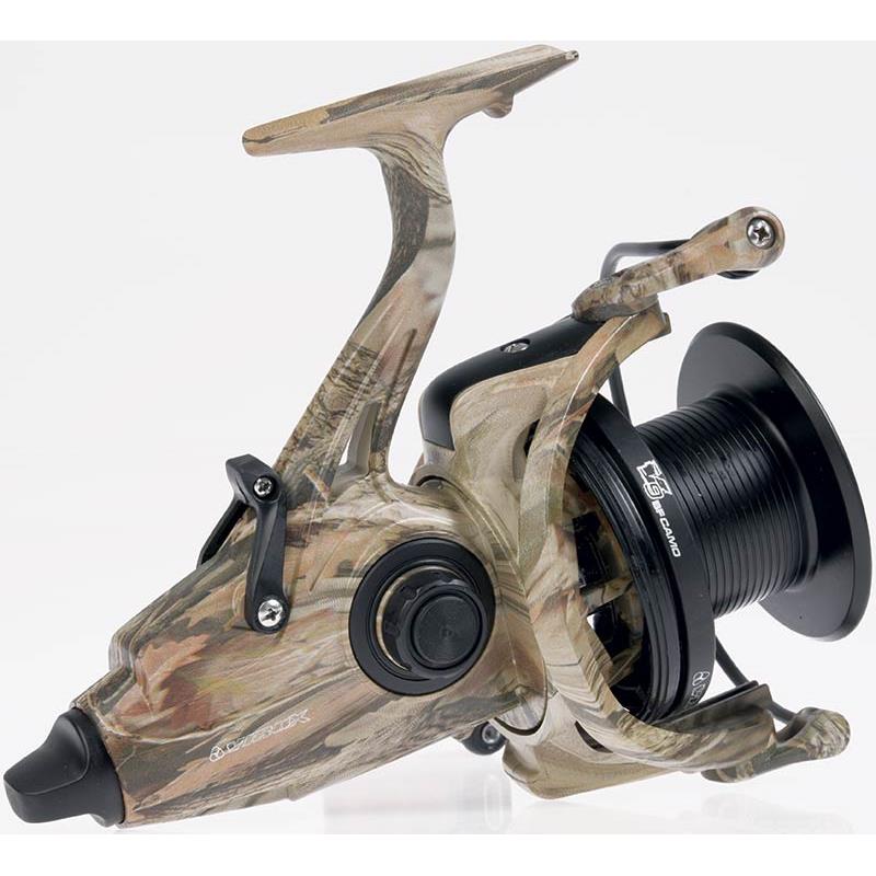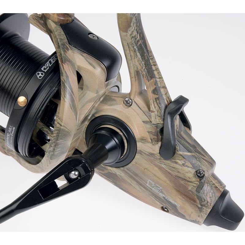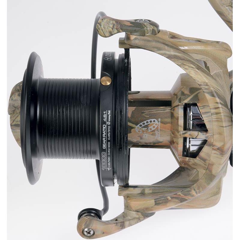 baitfeeder-Rolle für Karpfenangeln und Weitwurf in einem kompakten Design, aber mit großer Schnurkapazität. Baitfeeder-Spulenfreigabesystem. Gehäuse und Rotor aus Graphit, korrosionsbeständig. ultraleichte Rotorbauweise. Aluminiumspule mit langem Hub (Aufwickelhöhe von mehr als 40 mm) zur Verbesserung der Wurfleistung. 5 Kugellager + 1 Rücklaufsperre (unendlich). schnelle Einstellung der Rücklaufsperre. mikroverstellbares, schnelles und progressives Bremssystem : mit 180º Drehung wechselt es von der geringsten zur höchsten Bremskraft. Großkapazitäts-Aluminiumspule mit Schnurklemmung aus Edelstahl. Rotorbremssystem, um die Bewegung des Rotors während des Wurfs zu verhindern. übergroßer Schnurführer mit Metalllager. gefräste Aluminiumkurbel mit Holzknauf.