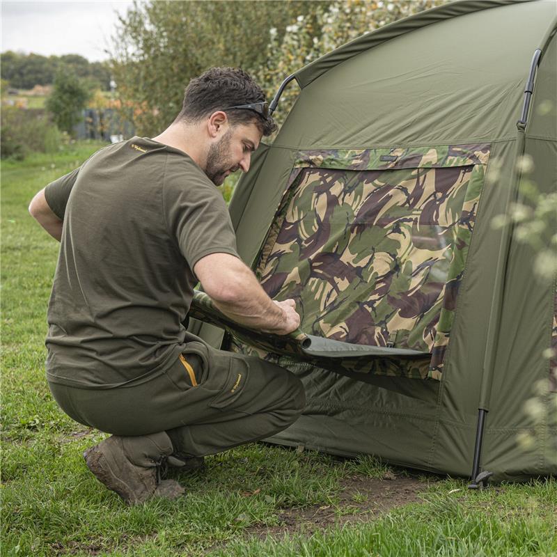 Geliefert mit: • Taktische Viertelhaube • Taktisches Bivvy mit fester Füllung vorne • Taktische Mozzy-Front • Sehr strapazierfähige Reißverschlussbodenmatte • Deluxe-Tragetasche • Spanngurte • Satz von Zeltheringen