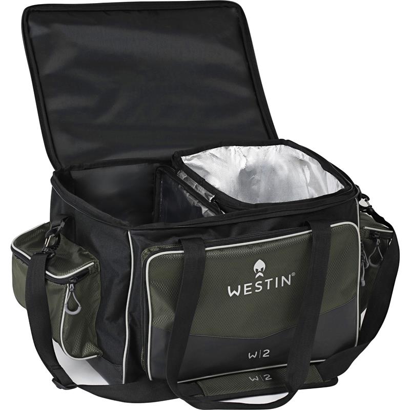 • Abmessungen : 65 x 43 x 34 cm • Hauptmaterial : diamantgewebtes Polyester / schwarzes Polyester 600D mit Beschichtung • Wasserabweisende Materialien • XXL-Fach, das 4 große Westin-Köderboxen aufnehmen kann (36 x 22,5 x 8 cm) • Separate Isoliertasche mit Reißverschluss und Griff inklusive • Frischebox mit luftdichtem Silikondeckel inklusive • 1 große Fronttasche und 2 seitliche Taschen mittlerer Größe • Tragegriff und gepolsterte Schultergurte