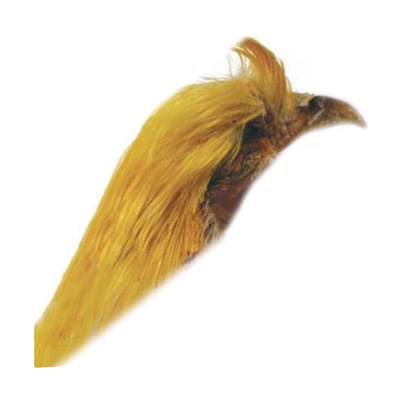 Wunderschöne, goldgelb gefärbte, gebogene Feder, bestimmt zum Binden von Lachs- und Nassfliegen. Ganzer Kopf.
