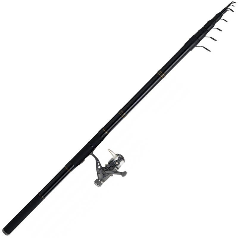 einstellbares Forellen-Set. Rute sweepfire aus Carbon, mit einem Transportmaß von 125 cm, ausgestattet mit 4 verstellbaren Ringen, Aluminiumoxid-Ringen und sensibler Spitzenaktion. Rolle q820rm mit Vorderbremse.
