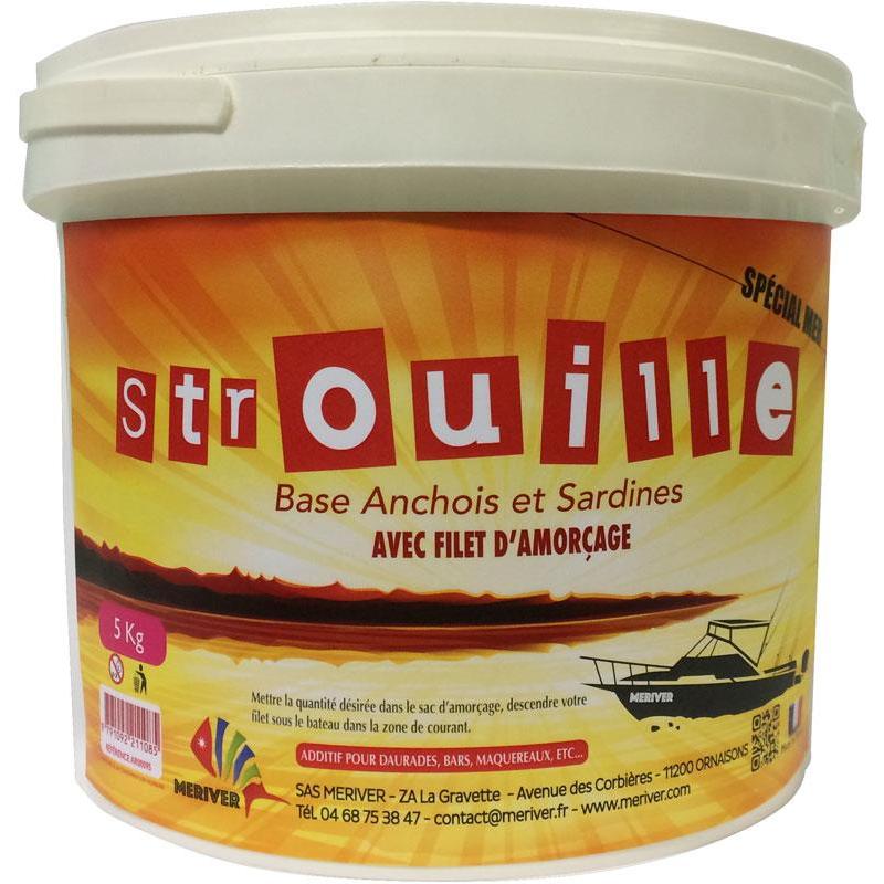 la strouille meriver ist ein Rezept auf Basis ganzer frischer Sardellen und ganzer frischer Sardinen, zerkleinert mit Brot und Salz, kompaktiert für eine längere Anfütterungsdauer. diese Rezeptur ermöglicht es, vom Boot aus zu angeln und Wolfsbarsch (loup), Makrele, Pferdemakrele, Meerbrasse... dieses Produkt wird mit einem Anfütterungsbeutel geliefert.
