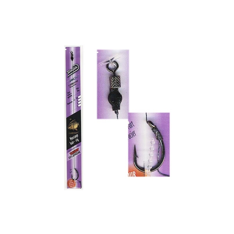 Hair-Rig-Montage, technische Geflechtschnur Technitop. Länge 22cm für vielseitigen Einsatz. Montage hergestellt mit Haken Daï Steel und der Schnur 100% Technitop 12kg Black (Zugkraft garantiert). Herstellung : Knotenloser Knoten am Haken, mit einem Tropfen flüssigem Snake skin stabilisiert. Wirbelknoten gesichert, Silikon-Finish. Packung mit 1 Montage. Mit kostenlosen Köderstoppern. Starker Stahl, für abgehobene "pop-up"-Montagen.