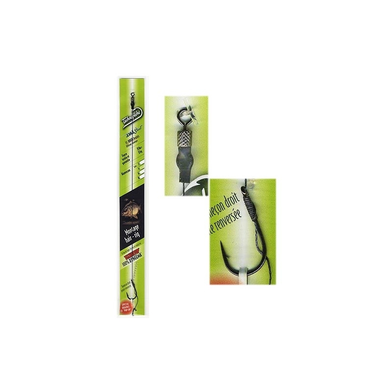 Haarmontage in Technitop-Geflechttechnik. Länge 22cm für vielseitigen Einsatz. Montage ausgeführt mit Haken von Daï Steel und dem 100% Technitop-Geflecht 12kg Black (garantierte Festigkeit). Herstellung : Knotenloser Knoten am Haken, stabilisiert mit einem Tropfen flüssigem Snake skin. Gesicherter Wirbelknoten, Silikon-Finish. Tasche mit 1 Montage. Mit kostenlosen Köderstoppern. Gerader Haken mit umgekehrter Spitze, speziell für Körner und "pop-up".