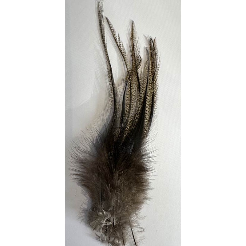 Hahnenlanzetten pardo grad 1 von außergewöhnlicher Qualität. Diese Federn werden aufgrund ihrer langen, glänzenden und punktierten Fasern für die Herstellung von Nymphen-Schwänzchen und Trockenfliegen, aber auch für die Fertigung von Nassfliegen verwendet.