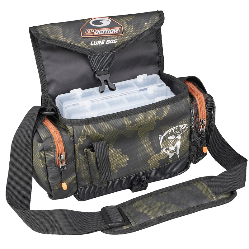 • ködertasche mit 3 herausnehmbaren, unterteilten boxen • ideal zur aufbewahrung kleiner wobblers oder gummiköder • seitentaschen mit reißverschluss zur aufbewahrung von zubehör, eine aus gummiertem netz, die andere aus stoff; vordertasche für zange • verstellbarer schultergurt. • stoff mit tarnmuster.