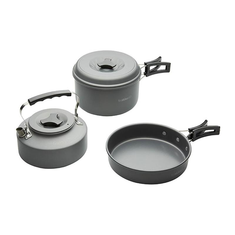 Eigenschaften : • Das Set beinhaltet eine Bratpfanne, einen Topf mit Deckel und einen Wasserkocher. • Leicht und kompakt. • Eine eloxierte Antihaftbeschichtung • Hitzebeständige, klappbare Griffe • Wird mit einem Netz-Tragebeutel geliefert • Material : Aluminium mit einer eloxierten Beschichtung • Abmessungen : Bratpfanne : 17.7 cm x 3.9 cm. Kapazität : 750ml. Topf : 17.4 cm x 10.9 cm. Kapazität : 1.7 Liter. Wasserkocher : 15.2 cm x 7.8 cm. Kapazität : 1.1 Liter. • Gewicht : 651 Gramm