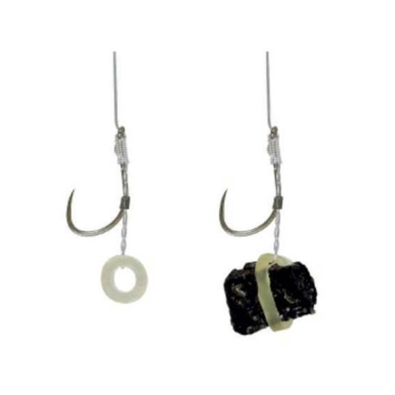 Feeder-Montage von großer Feinheit, gefertigt mit barblosen Haken OWNER 56741 Picket hook. Speziell für das Angeln in Carpodromen konzipiert. Starker Eisenhaken, äußerst vielseitig.Etui mit 6 montierten Haken.