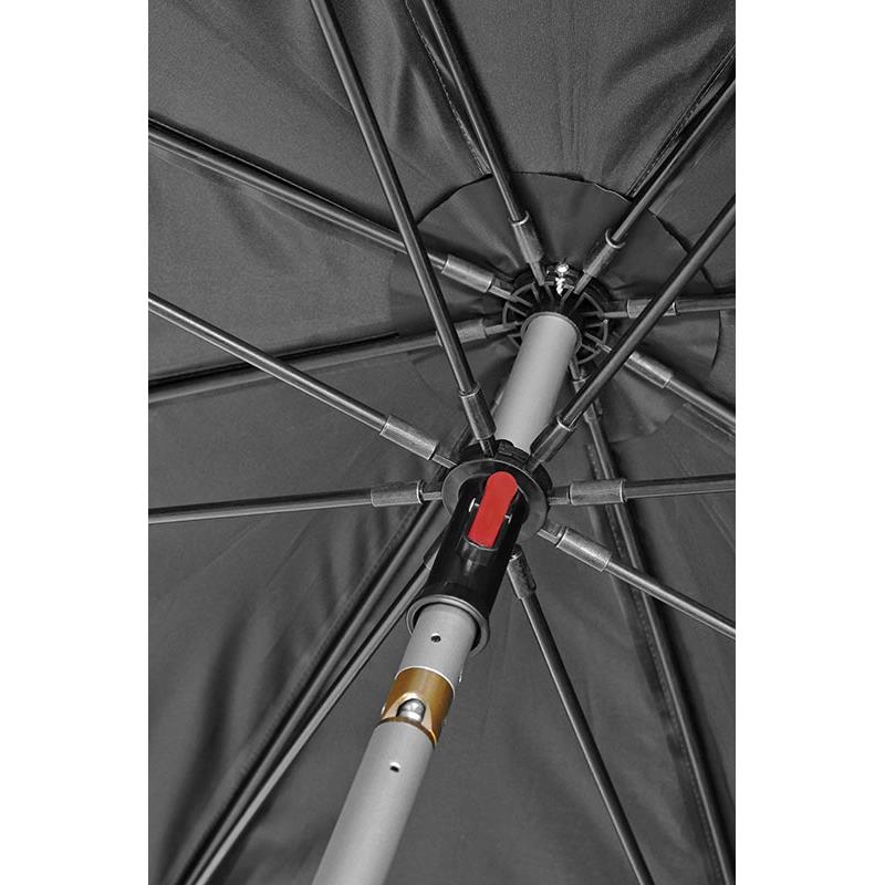 Regenschirm aus dickem, mit PVC beschichtetem Segeltuch. Die Streben bestehen aus Glasfaser mit großem Durchmesser und wurden an einer Seite gekürzt, um eine doppelte Funktion zu haben: das Volumen zu verringern, um das Werfen und Entnehmen des Fisches mit der Spitze der Rute zu erleichtern, und die Stabilität zu erhöhen, wenn die Rute in Bewegung ist. Das Schirmdach wird mit den mitgelieferten Heringen am Boden befestigt. Wird mit zwei Heringen und einem Riemen geliefert, um ihn am Boden zu fixieren.