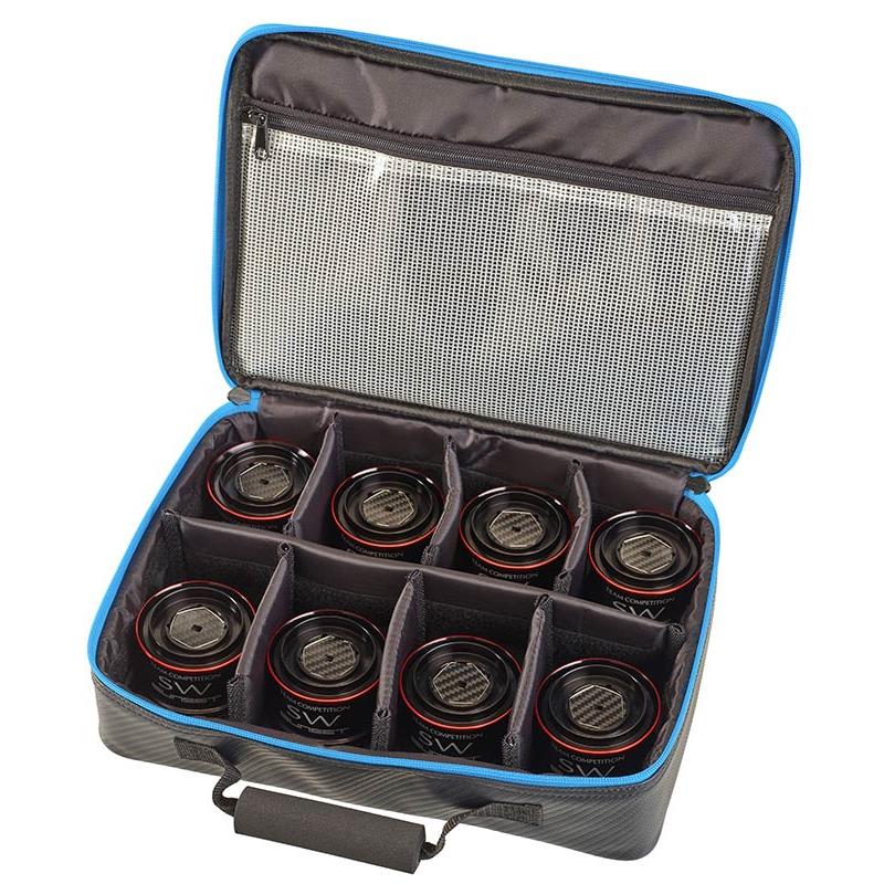 Eigenschaften : • Aufbewahrungstasche • Speziell für Angelrollenspulen • Verfügt über 8 verstellbare Fächer • Dickes, wasserdichtes Gewebe • Widersteht Wasserspritzern • Ideal für Spulen von Surfcasting-Angelrollen • Ergonomischer EVA-Schaumgriff