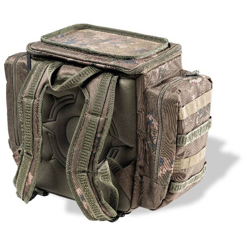 Der Rucksack steht selbst im leeren Zustand aufrecht und dank seiner zippbaren Öffnung an drei Seiten ist der Zugriff auf den gesamten Inhalt einfach und schnell. Im Inneren bieten zusätzliche Organizer‑Taschen eine optimierte Aufbewahrung. Der Deckel enthält ein hartes EVA‑Arbeitsbrett, praktisch, um Telefon, Empfänger, Vorfächer oder Köder griffbereit und vom Boden fernzuhalten.