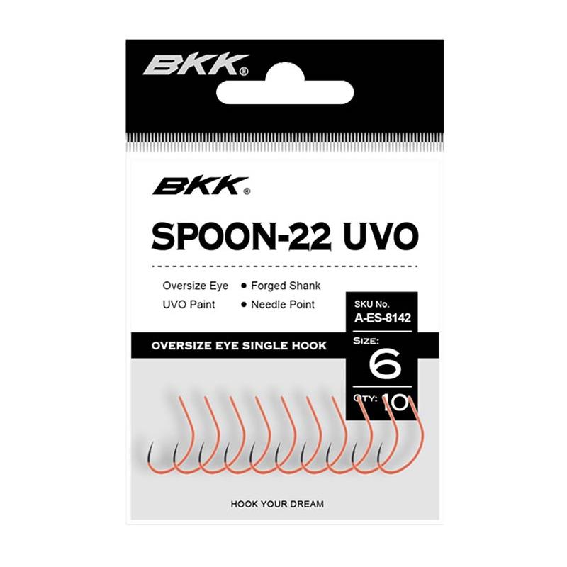 Der BKK SPOON-22 UVO ist ein Ersatzhaken für Metallblinker moyen/lourd, ideal für große Forellen und Lachse in Süß- und Salzwasser. Der Haken verfügt über ein übergroßes Öhr für bessere Beweglichkeit, eine nach innen gerichtete Spitze, um Hänger zu vermeiden, und eine BKK UV-Beschichtung, um den Fisch zu stimulieren und mehr Bisse auszulösen.