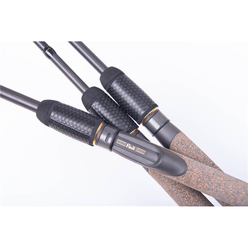 Jede mitgelieferte Carbonspitze ist jetzt weicher und progressiver und im Vergleich zum klassischen Carbonmaterial deutlich verbessert. Jede zweiteilige Rute wird mit übergroßen Fuji-Guides und einem Fuji-Rollenhalter geliefert. Der einzigartige gummierte Griff sorgt dafür, dass der Halt niemals verloren geht, unabhängig von den Witterungsbedingungen, und jede Rute wird mit 2 hochwertigen Neopren-Riemen sowie einer Stoffhülle geliefert.