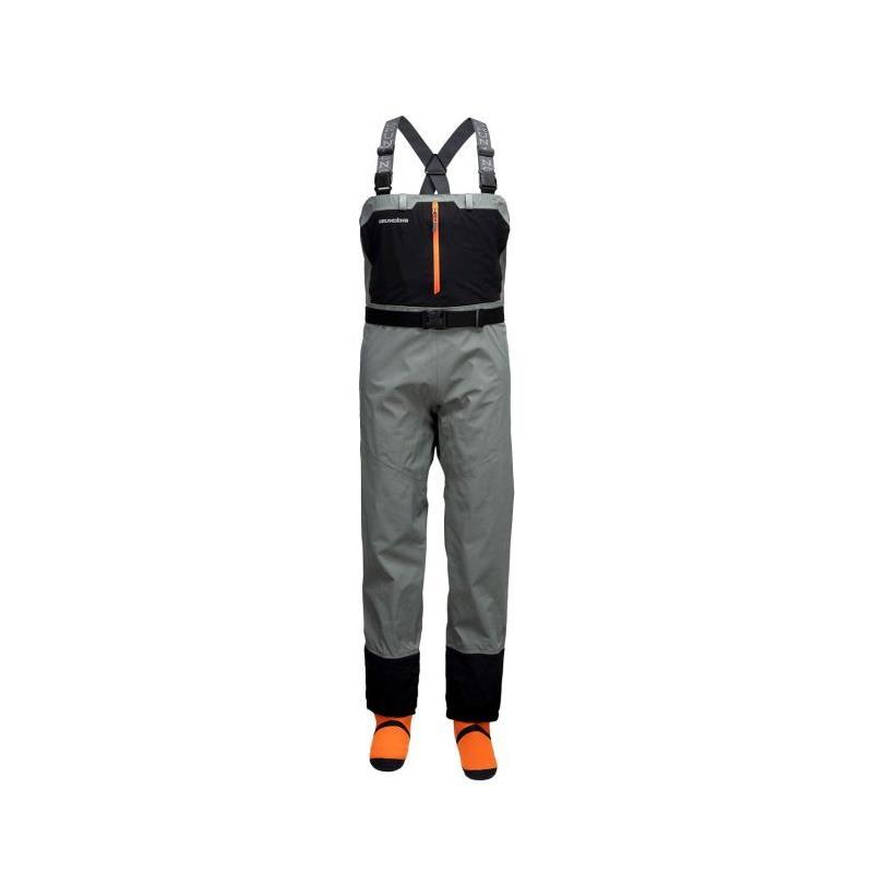 Der MEN'S BEDROCK STOCKINGFOOT WADER verfügt über ein ultra-dichtes Außenmaterial aus 100 % Nylon kombiniert mit einer langlebigen, 4-lagigen Laminierungsbeschichtung, die durchstoßfest ist und ihm hohe Widerstandsfähigkeit verleiht. Speziell zum Angeln geeignet, verfügt dieser Wader über strategisch platzierte Reißverschlusstaschen, um die Ausrüstung griffbereit zu halten, sowie über wasserfeste, mit Reißverschluss versehene Handwärmetaschen. Mit seinen wärmenden Neopren-Fußteilen ist er ideal für lange Angelsessions.