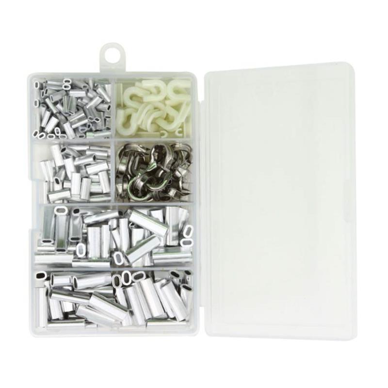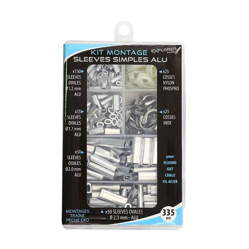 Ultra-complete, ready-to-use kit for all your sleeve rigs: 300 double sleeves (sizes 1.3 to 2.2 mm) + 50 thimbles (25 stainless S + 25 phospho nylon L). Ideal for making attachments and loops on all your heavy-diameter leaders (nylon, fluorocarbon, steel wire, etc.) The transparent storage box allows you to immediately see the contents. It has partitioned compartments to isolate each sleeve size and the different protective thimbles for your loops.
