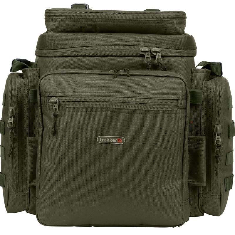 It features a top pocket with a removable EVA rig tray, equipped with an integrated magnetic corner to keep rig components secure. A large zippered front pocket is ideal for bait boxes and accessories, as well as large internal and side zip pockets that have reinforced open pockets behind the zips for additional storage. Elastic and webbing loops located on both sides allow easy storage of accessories, ensuring your gear is always within reach.