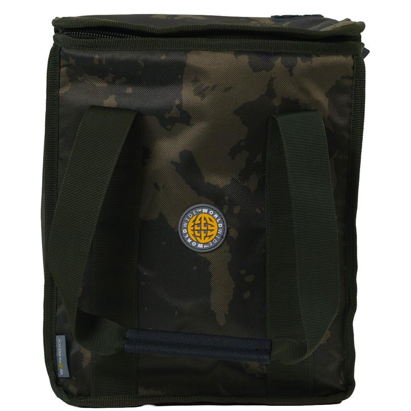 Standard : • Constructed from Worldwide camo 600D fabric with PU coating • Double carry handles • Thermally lined inner compartment • Large zippered mesh pocket in the lid • Durable, waterproof PVC base • Ideal for keeping bait and other temperature-sensitive items cool • Main compartment dimensions (cm) : 25 × 20 × 30 • Overall dimensions (cm) : 26 × 21 × 31 • Capacity : 16 litres