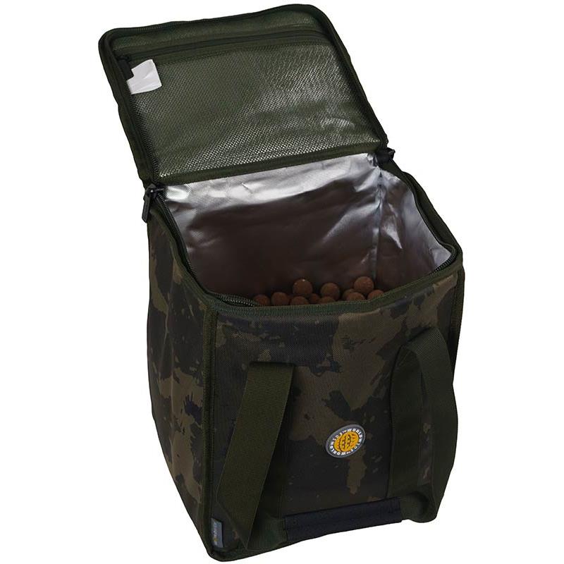 XL : • Constructed from Worldwide camo 600D fabric with PU coating • Double carry handles • Thermally lined inner compartment • Large zippered mesh pocket in the lid • Durable, waterproof PVC base • Ideal for keeping bait and other temperature-sensitive items cool • Main compartment dimensions (cm) : 30 × 24 × 45 • Overall dimensions (cm) : 31 × 25 × 46 • Capacity : 35 litres