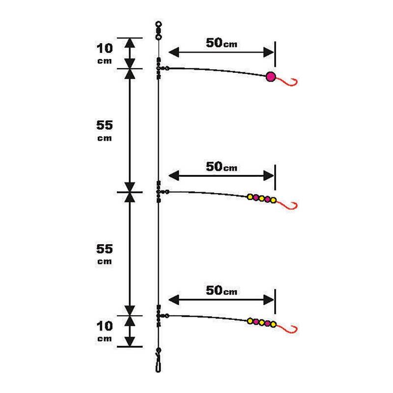 • Rig: special flat fish (flounder, sole, dab, plaice...) • Bait: coastal worms, small shellfish, mackerel or sardine strips • Tip: Use a 150g detachable sinker • Length 130cm • Line body 50/100 • Leaders: 30/100 • 3 fluorocarbon snoods of 50cm • Hook #4