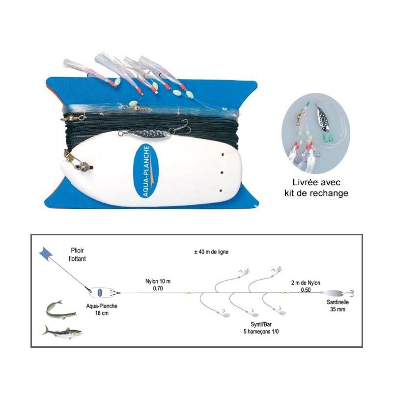 The line includes: - Floating planer. - 10 m nylon line at 0.70/100 including 5 syntil'Bar droppers with 5 hooks no. 1/0. - 2 m nylon leader at 0.50/100 with Sardinelle 35 mm.
