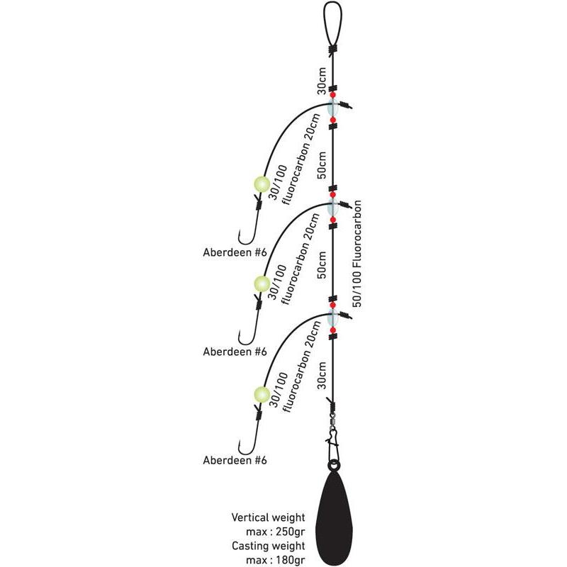 Rig made from fluorocarbon with 3 snoods each featuring floating beads and Aberdeen hooks in size n°6. Rigs stored on red foam rolls, packaged in pairs.
