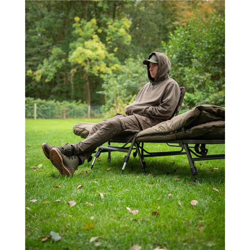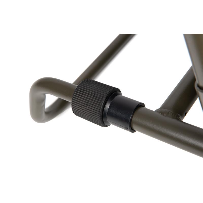 • Lightweight aluminium construction. • 3D mesh and polyester seat, with peripheral peach-skin camouflage fabric. • New one-touch spring leg mechanism for easy height adjustment. • Large pivoting feet for stability. • Adjustable frame with three usage positions: on the bedchair, on the side of the bedchair frame, at the front of the shelter or as a standalone low chair. • Adjustable seat height: 24–28 cm. • Seat width: 52 cm; Backrest height: 53 cm. • Folded dimensions: 22 × 58 × 81 cm. • Weight: 4.8 kg. • Materials: Outer fabric 100 % polyester ; Padding/filling 100 % polyurethane.