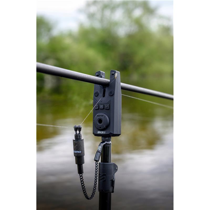the sonik gizmo litez bob is a fully adjustable and highly adaptable bobbin indicator system that is supplied with two opti-curve chains of different lengths. the chains, which measure 100 and 180 mm, have a screw fitting at each end. the base end screws into the bottom of the bobbin head (or into the removable 10 g screw) and the top end screws into the super-strong hockey-stick fitting that sits beneath the bite alarm. the removable 10 g weight can be unscrewed from the base of the bobbin for an ultra-light presentation or added to the base of the bobbin when distance fishing, where more weight may be required. the choice of chain length will depend on the indicator presentation required and, as a general rule, tight-line fishing will normally require a shorter chain and loose-line fishing will require the use of a longer chain.