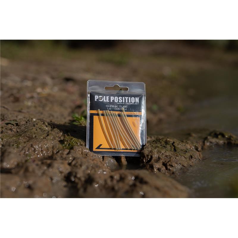 The diameter of the shrink tube is 1.6 mm and it shrinks by about 2/3 and becomes rigid once steamed. The shrink tube fits hooks size 4 to 10 and is available in limy brown and grass green.