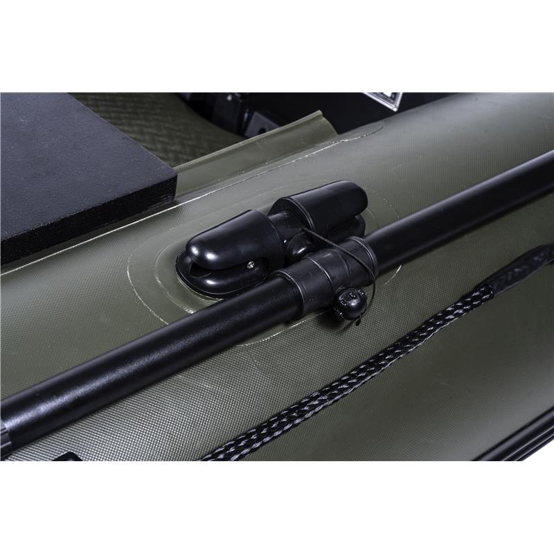 Main features • Additional inflation chamber to add a V-shaped keel for increased stability and easier navigation • Inflatable floor as standard for a solid base and better stability • Reinforced sections to prevent wear • Reinforced PVC bases of 0,9 mm, PVC under-tubes of 0,7 mm for increased strength and resilience • Improved drain plug design to prevent any loss • Extra-thick protective strips on the base and sides to protect against damage caused by moorings, concrete or natural banks • Black aluminum oars • Black wooden seat • Reinforced black PVC anchor point • Safety valve • Sturdy para-cord rope handles • Foot pump and puncture repair kit included • Carrying bag included