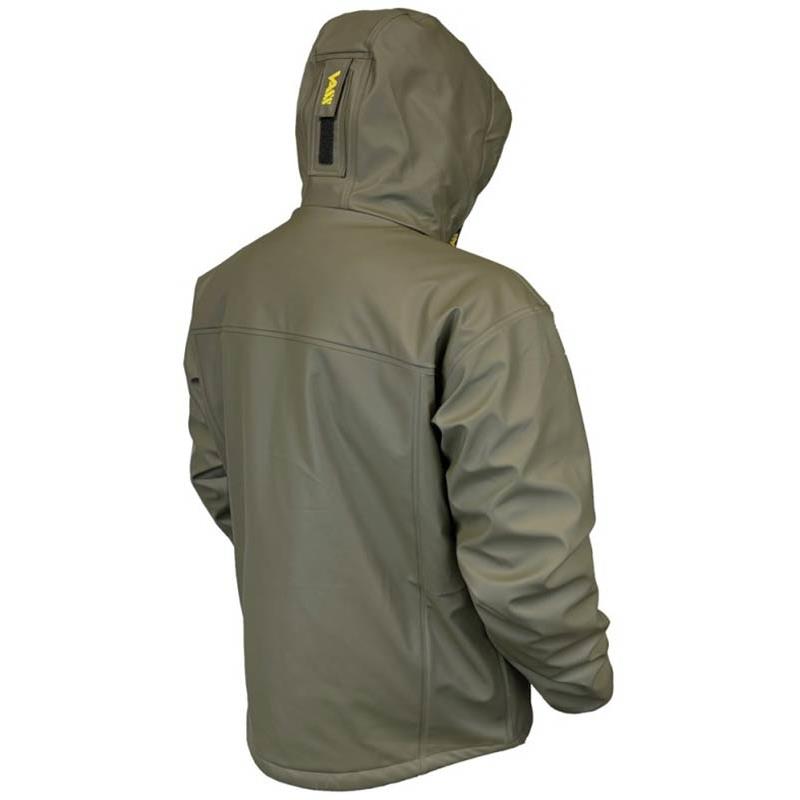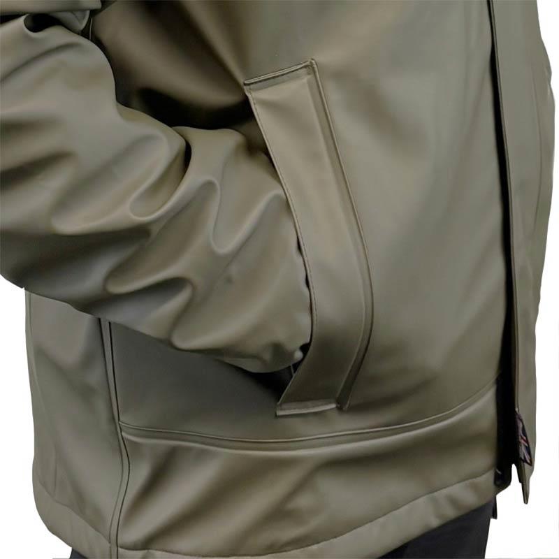 Winter lined jacket – Khaki Edition : • Storm hood with elastic cord and stoppers, plus a rear adjustment tab to set the visor. • Elasticated cuffs with fastening flap. • Two outer hand pockets with reversed YKK zips, handy for resting hands between casts. • Left-side inner chest pocket with YKK zip, ideal for a phone or small accessories. • Front YKK zip with double storm flap. • Hem drawcord with stoppers on both sides. • Fabric easy to repair. • Extended back for better protection and improved water runoff.