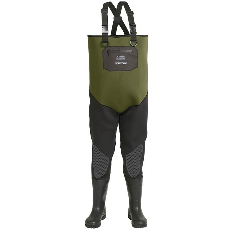 • Waders in neoprene bicolor thickness 4,5mm double-faced jersey • Neoprene-lined rubber boots • Non-slip lugged rubber soles • Flexible front pocket with semi-waterproof zipper • Adjustable shoulder straps with quick-release buckles • Abrasion-resistant knee reinforcement • Dimensions optimized for maximum comfort