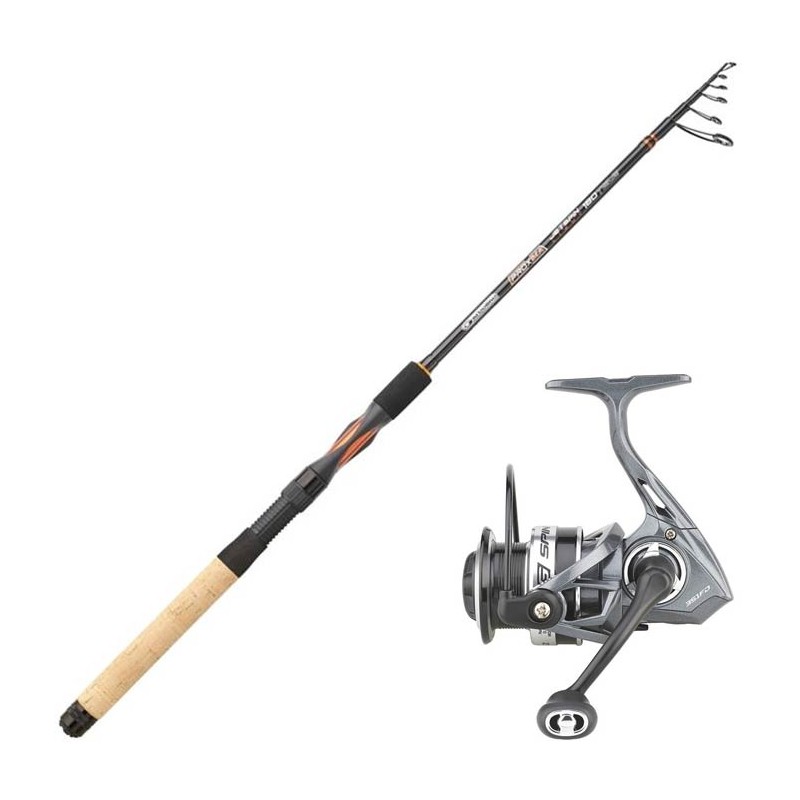Set of telescopic spinning rods and a front-drag reel, ideal for casting in fresh or salt water for targeting predatory fish, pike, zander, trout or perch.