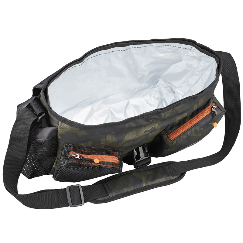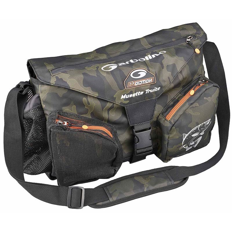 • trout shoulder bag with removable inner pocket with insulated lining • 2 front pockets with single-pull zippers, one of them in rubber mesh • pliers pocket on the left side • lid with access opening • waterproof zipper on the flap and on the rear part • flap with quick buckle • mesh bottle pocket • adjustable shoulder strap. • camouflage-effect fabric